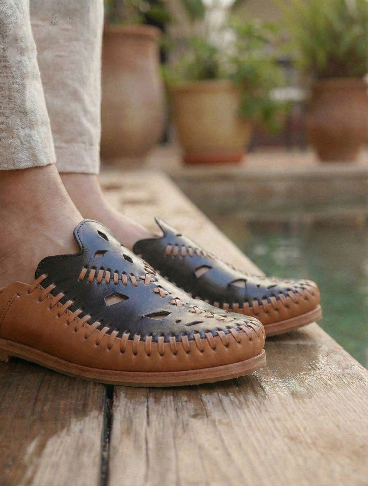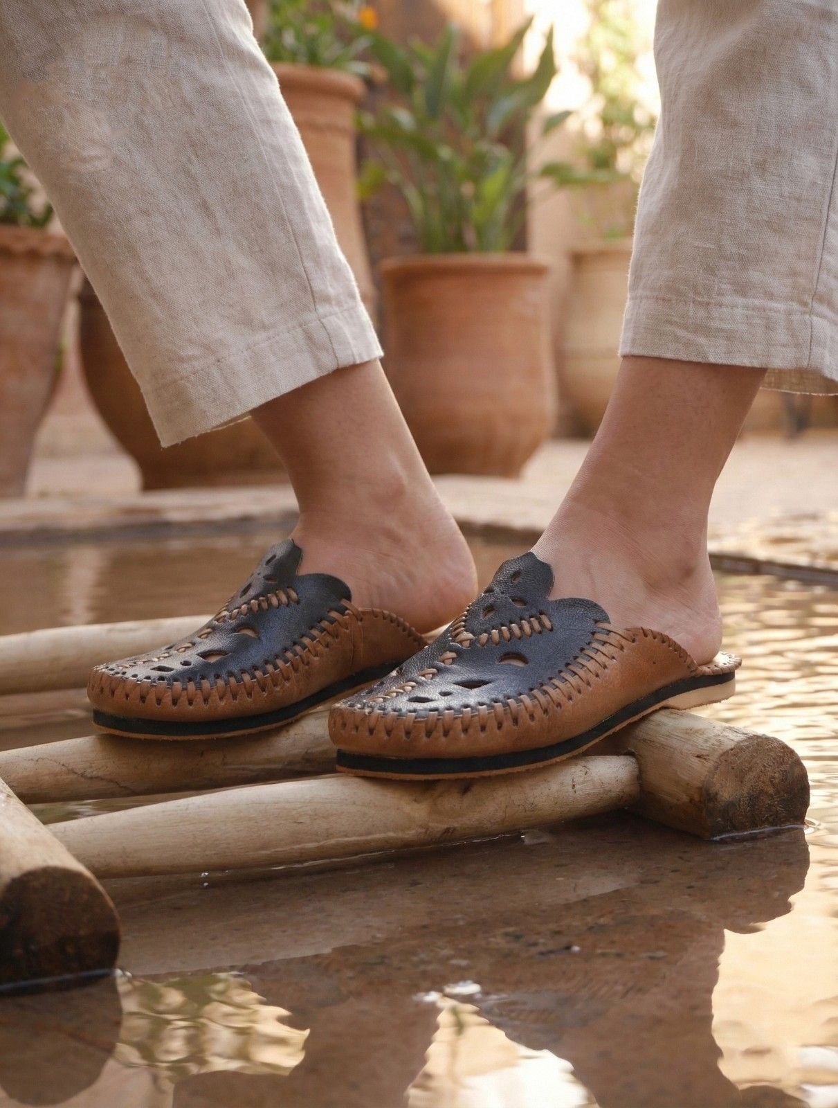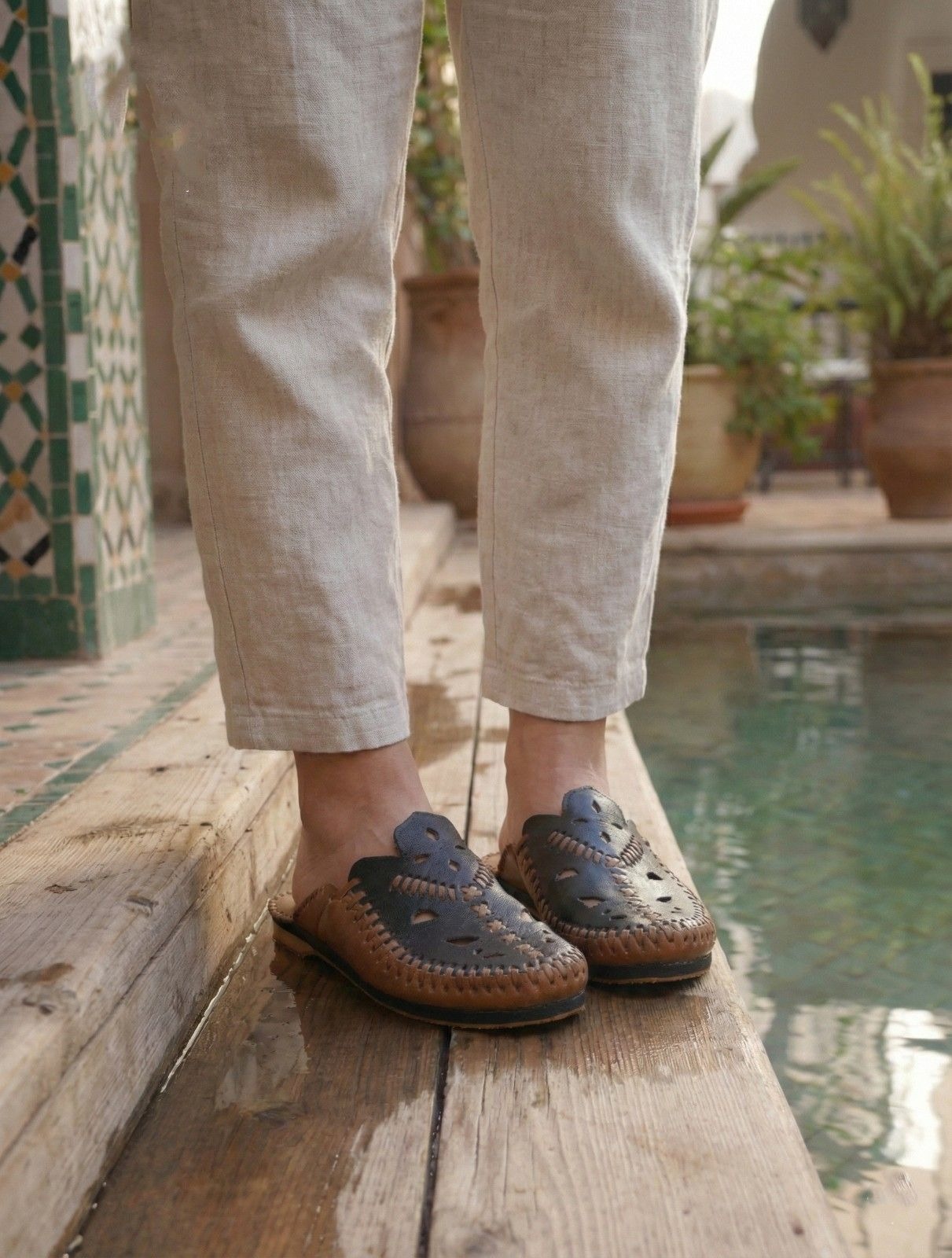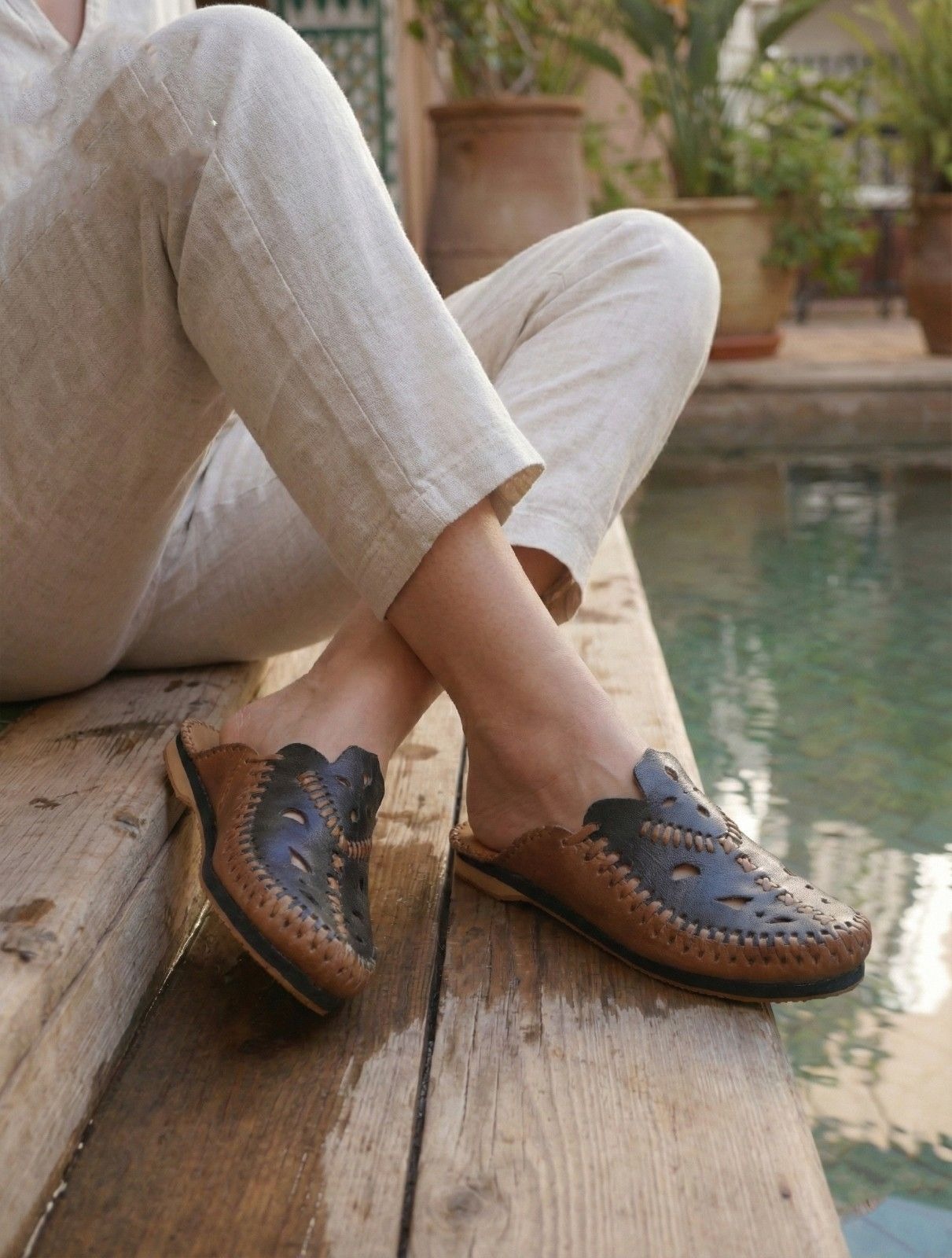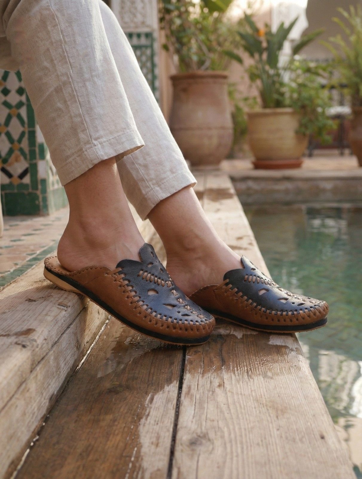 You can bring the calming atmosphere of Morocco into your home. The Blue Moroccan Leather Slippers, the Zahra edition, reflect the famous blue walls of Chefchaouen. Our artisans in the mountains craft each pair with patience and precision.