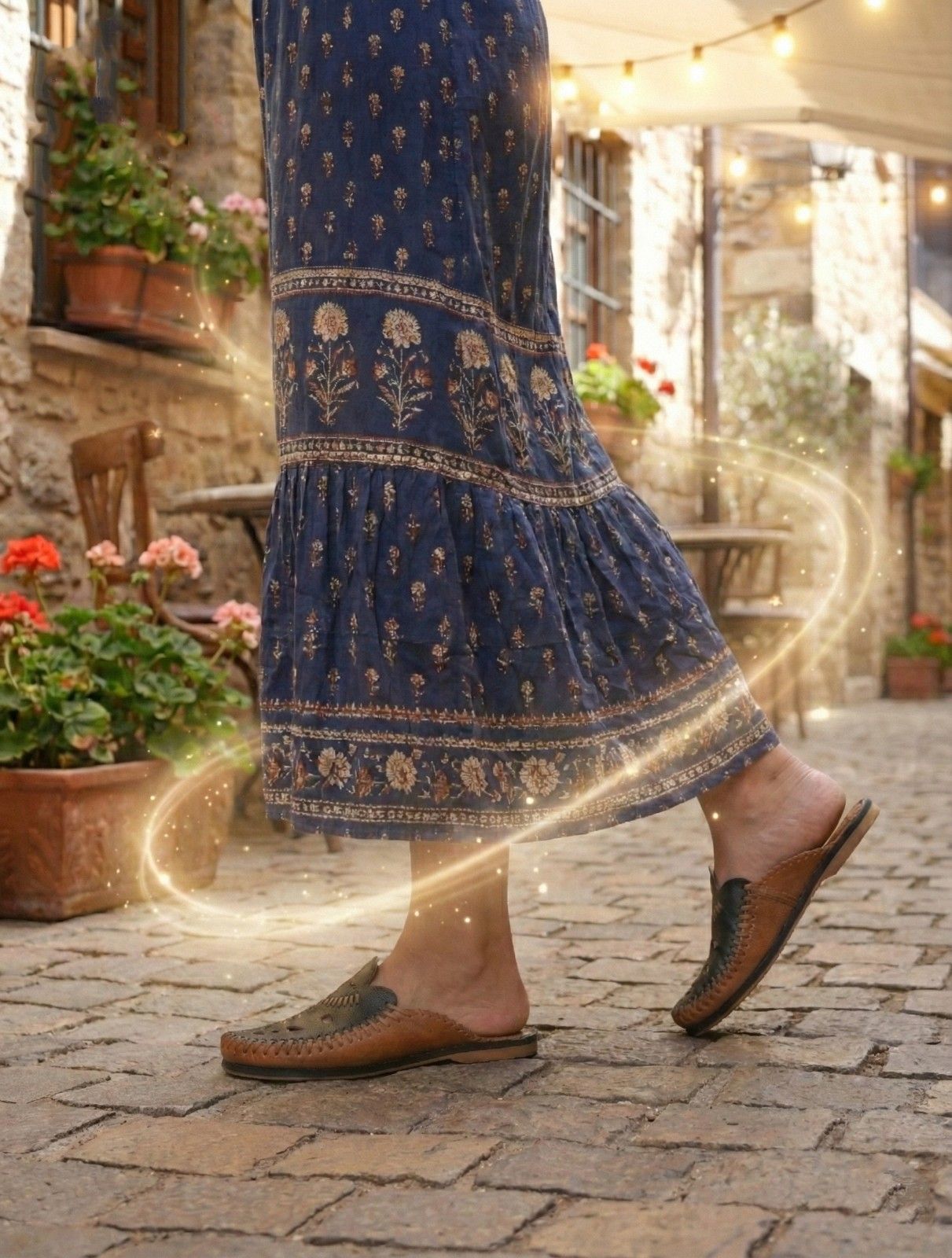 Artistry in Leather We dye the soft goat leather to achieve this specific, vibrant blue. Then, a master craftsman punches the decorative geometric patterns by hand. Unlike printed designs, these cut-outs allow your feet to breathe comfortably. Furthermore, we stitch the upper to the sole using strong, white thread. This creates a beautiful contrast. Therefore, these slippers are as durable as they are beautiful.